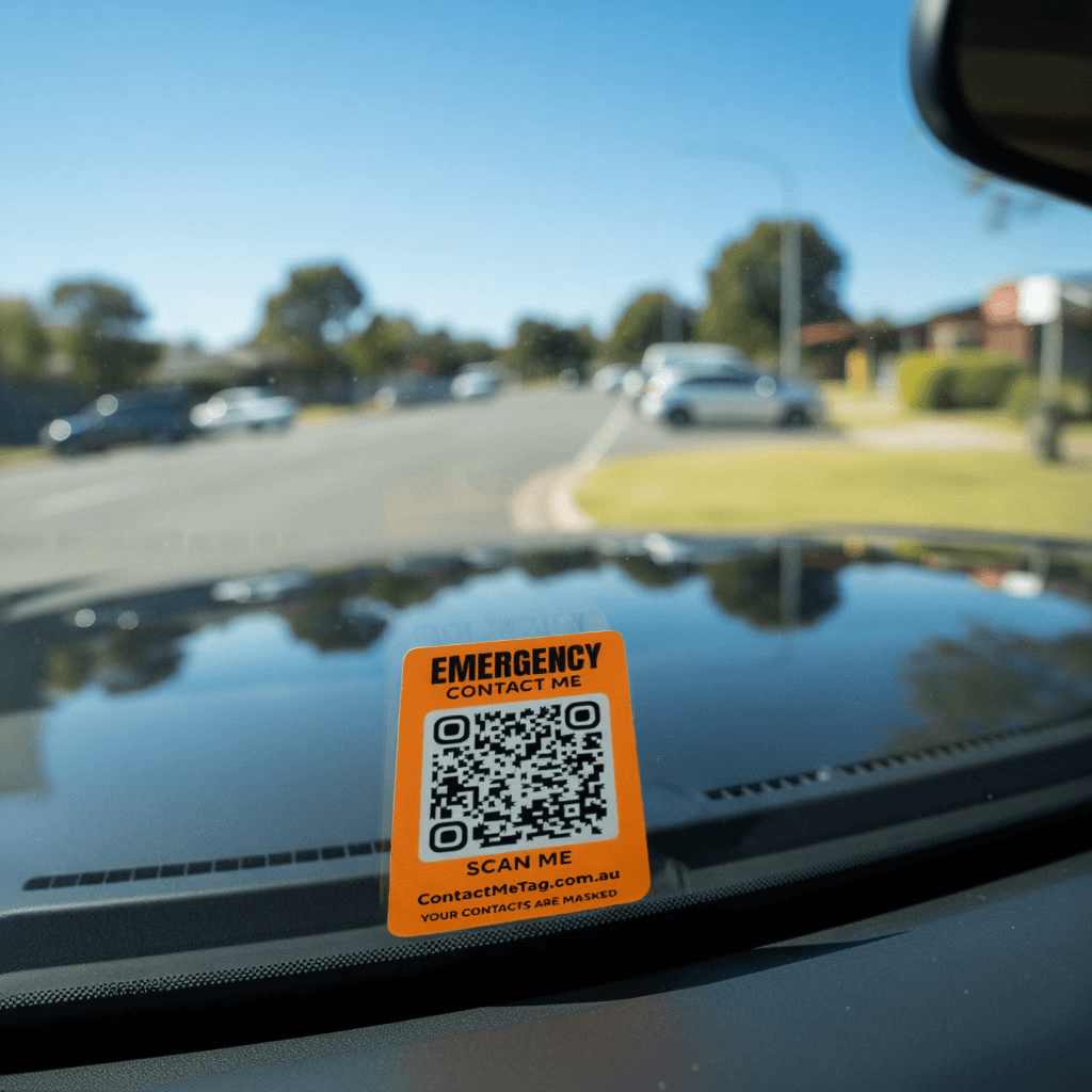 Weatherproof vehicle windscreen sticker scan instantly by a Good Samaritan and contact your emergency contact if you are ever unconscious — manufactured in Australia.