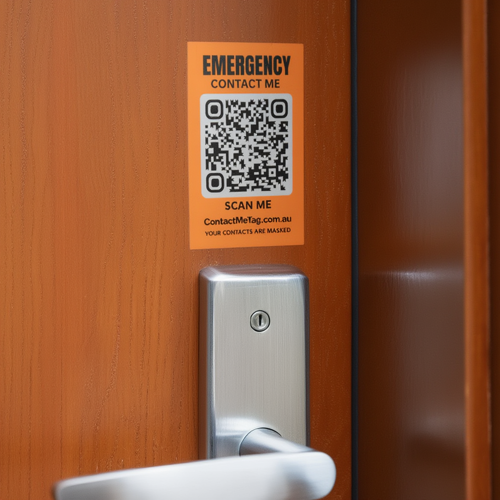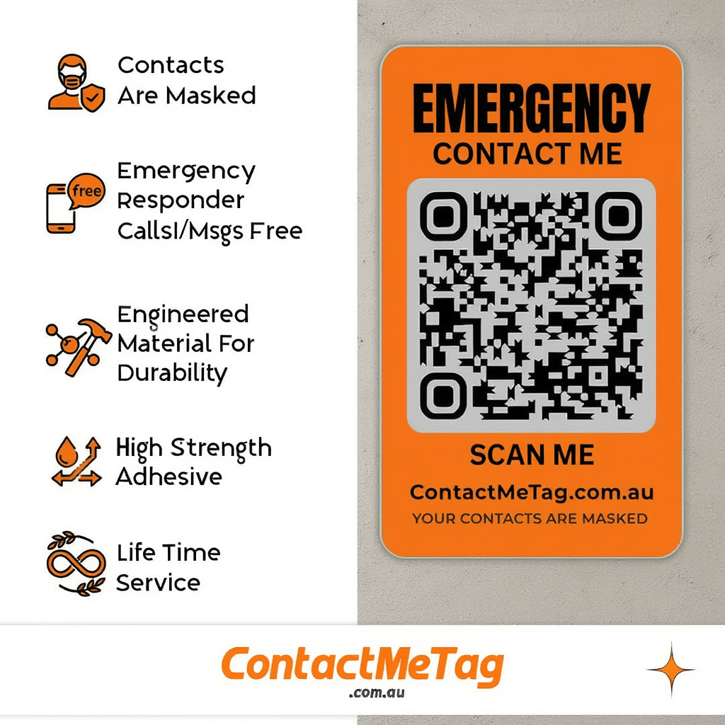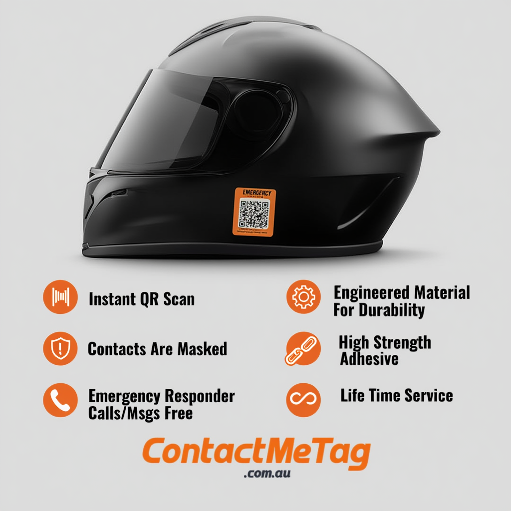 Compact sticker for helmet, motor bike, equipment or any asset surface. Quick scan contacts your emergency contact instantly — manufactured in Australia.
